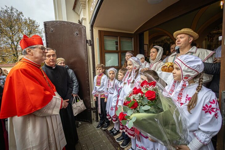 O godzinie 12.00 licznie zgromadzeni wierni powitali w bazylice specjalnego wysłannika papieża. Na progu świątyni kardynała Claudio Gugerottiego przywitał biskup piński Antoni Dziemianko wraz z rodziną miejscowych parafian. Młode małżeństwo powitało wysłannika Ojca Świętego tradycyjnym białoruskim chlebem i solą, a dzieci skierowały do kardynała wierszowane słowa powitania.