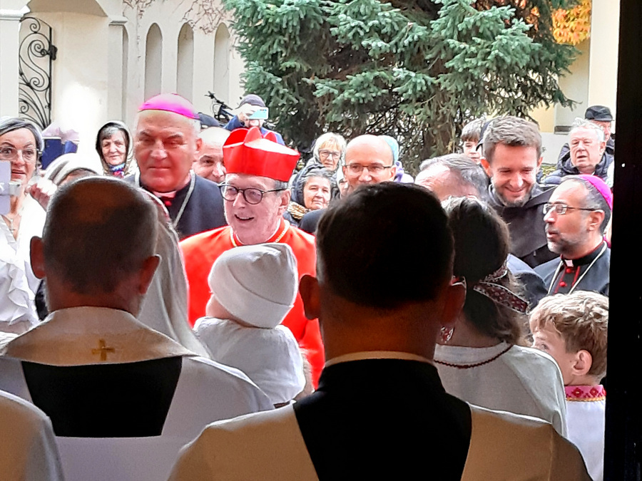 O godzinie 12.00 licznie zgromadzeni wierni powitali w bazylice specjalnego wysłannika papieża. Na progu świątyni kardynała Claudio Gugerottiego przywitał biskup piński Antoni Dziemianko wraz z rodziną miejscowych parafian. Młode małżeństwo powitało wysłannika Ojca Świętego tradycyjnym białoruskim chlebem i solą, a dzieci skierowały do kardynała wierszowane słowa powitania.