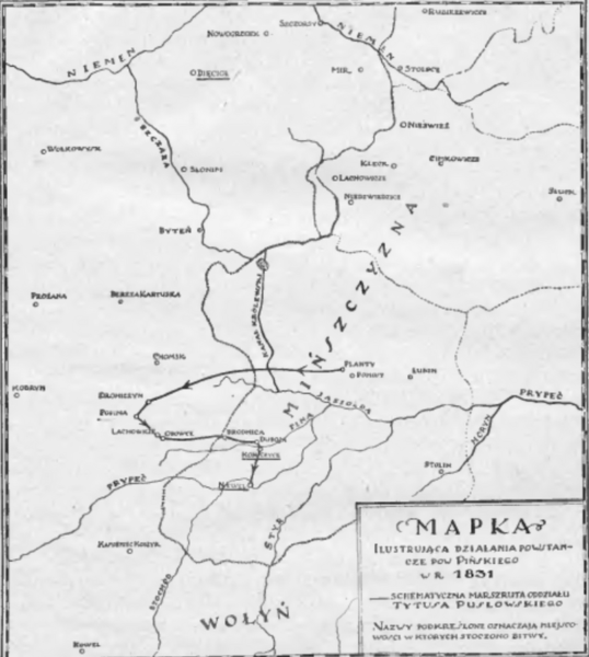 W chwili, gdy powstanie litewskie było prawie zupełnie zgniecione, gdy tylko tu i ówdzie słabe oddziałki partyzanckie trzymały się jeszcze w bardziej niedostępnych okolicach, — w południowo-zachodnim krańcu Mińszczyzny, u granic Grodzieńszczyzny i Wołynia, raz jeszcze porwano się do czynu. Mamy na myśli powstanie pińskie, podjęte przez Tytusa Pułsowskiego, jednego z pięciu synów Wojciecha, obywatela ziemskiego gub. Mińskiej, Grodzieńskiej i Wileńskiej, posła na Sejm Czteroletni, następnie zaś marszałka pow. Słonimskiego i prezesa Wileńskiego Tow. Dobroczynności (zmarłego w r. 1833).