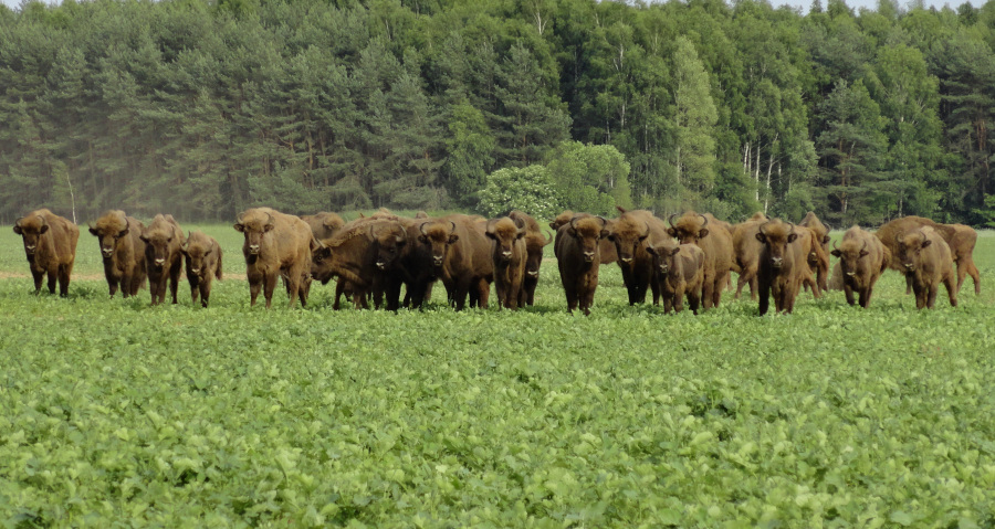 … a w tym samym czasie, w porę jesienno-zimową, gdy las oferuje już znacznie skromniejszy jadłospis, wychodzą puszczańskie mocarze na okoliczne pola, żerując na nich nawet całodobowo, gdy nikt ich nie niepokoi. A najbardziej żubry (także jak np. łosie lub jelenie) uwielbiają rzepak.