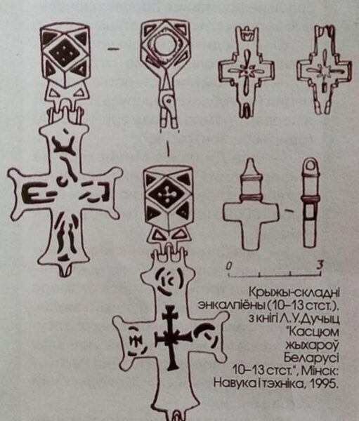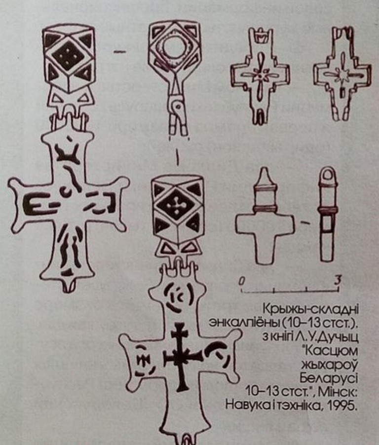 W szerszym kontekście dziejów chrześcijańskiej kultury materialnej warto wspomnieć o enkolpionach – relikwiarzowych krzyżach noszonych na piersi, znanych od starożytności. Były to najczęściej metalowe, dwuczęściowe, odlewane krzyże, zwykle z brązu, o wymiarach od około 2,2 na 4 do 7 na 12 centymetrów. Miały uszko do zawieszania, a ich ramiona mogły być zaokrąglone, rozszerzone lub proste, zakończone kroplowatymi wypustkami albo małymi krzyżykami. Na awersie zazwyczaj umieszczano reliefowe bądź schematyczne przedstawienie Chrystusa, na rewersie zaś Matki Boskiej z Dzieciątkiem. Zakończenia ramion zdobiono wizerunkami świętych, czasem opatrzonymi napisami. Znane były enkolpiony reliefowe, rytowane, grawerowane, niekiedy czernione, emaliowane lub inkrustowane srebrem. W Europie występowały od X do XV wieku, a na ziemiach dawnej Rusi produkowano je przede wszystkim w Kijowie. Na terenach dzisiejszej Białorusi odnajdywano takie krzyże między innymi w Połocku, Mińsku, Drucku, Mścisławiu, Witebsku, Mohylewie i Grodnie.