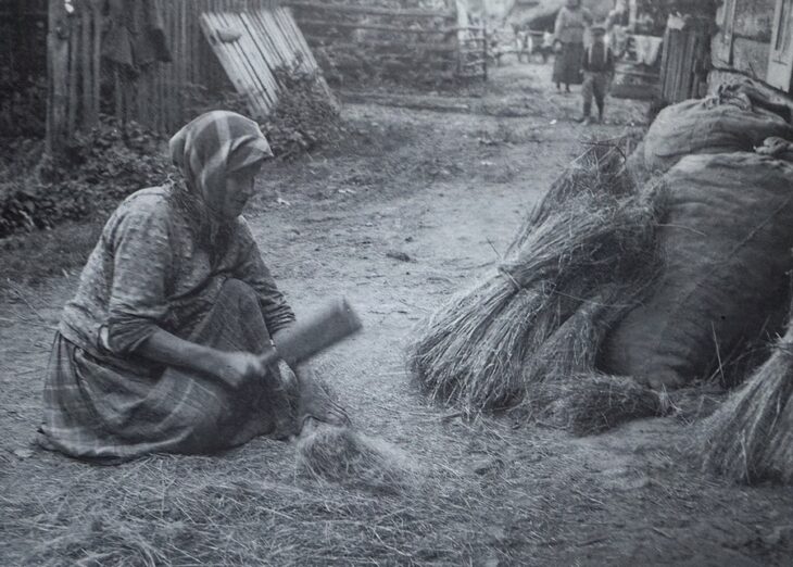 Gdy len rozścielony „wyleży się”, wtedy Póleszuczka zbiera go z powrotem w pęki, tylko większe, niż poprzednio, przywozi do domu i zabiera się do oczyszczania z paździerzy. W tym, celu suszy się na piecu i łamie w „ternyci” – międlicy. Obecnie jest ona często zastępowana przez maszynę do tarcia lnu, którą porusza korbą dwu chłopów i praca idzie o wiele szybciej. Z kolei ten len oczyszcza się ż paździerzy za pomocą „trypaczki”, podobnej do miecza, a zrobionej z drzewa. Uderzą się jej płazem w trzymane na „potasi” „powismo” – ilość włókien lnu, dającą się wziąć do garści – i włókna, związane w pęki, wędrują na strych. Wracają stamtąd dopiero zimą, gdy są „pryświata” (mniejsze święta). Wówczas bierze się „hrybyni” i na nich oddziela się czysty len ód pakuł. „Hrybyni” mają z jednej strony gwoździe, osa-dzone gęściej, a z drugiej rzadziej. Czyści się włókna najpierw na rzadkich, później na gęściejszych grzebieniach. Pakuły są chętnie nabywane przez jeżdżących po wsiach szmaciarzy, lub też przędzie się z nich grube nitki. Teraz „powisma”, oczyszczone jeszcze szczotką, zrobioną ze szczeciny, są zwijane po kijka w „kudelę” – kądziel. I tu dopiero następuje żmudne ślęczenie nad przekształceniem włókien lnu w nici. Kobieta przędzie, przywiązując kądziel do „potasi”, bądź na wrzeciono, bądź to na kołowrotek, podczas długich wieczorów i „doświtków” zimowych. (Doświtki–to ranne wstawanie na kilka godzin przed świtaniem).