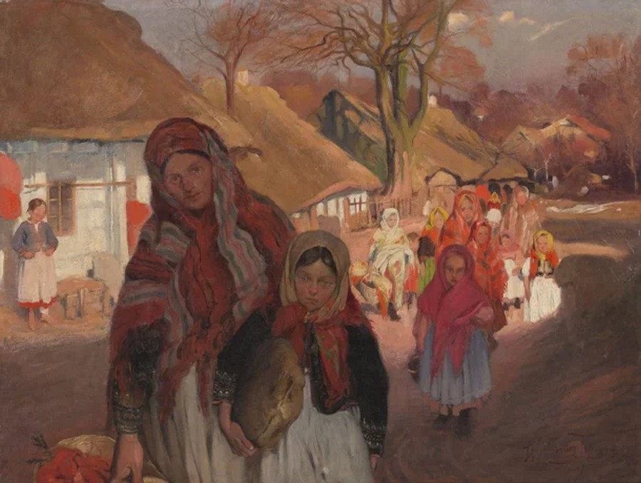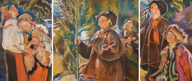 „Artysta stara się wiernie odtworzyć elementy ich ubioru: czerwono-graniaste podstoły – buty zrobione ze skóry i ściągnięte rzemieniem, lniane koszule artystycznie wyszywane na ramionach i piersiach, zamiast spódnicy – dwa długie, zachodzące na siebie, przetykane metalizowanymi nićmi fartuchy, typowy dla Hucułek kożuszek, wiosną noszony bez rękawów, oraz kolorowe chusty wiązane w przypadku panien, z tyłu głowy z wplecionymi ku ozdobie muszelkami” – opisuje tryptyk Marta Michalik w książce Wielkanoc w malarstwie.