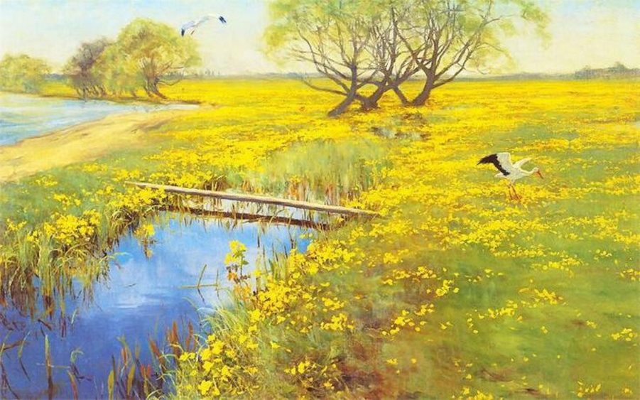 Nie ma piękniejszych obrazów oddających klimat tych wiosennych świąt niż „Kaczeńce”, „Ruczaj” Józefa Chełmońskiego czy „Wiosna” Henryka Weyssenhoffa. Strumień, nad strumieniem wierzby, kładka wiodąca na drugą stronę, bocian na łące i morze kaczeńców. To właśnie jeden z najpiękniejszych rozsłonecznionych wiosennych pejzaży w malarstwie polskim – „Wiosna” Weyssenhoffa.