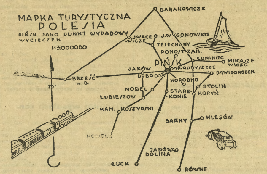 Miasto Pińsk – serce Polesia, posiada 40.000 mieszkańców, ma dogodną i bezpośrednią komunikację kolejową z Warszawą przez Brześć, oraz z Wilnem i Lwowem przez Łuniniec, a poza tym wodną i b. tanią komunikację we wszystkich kierunkach rzekami: Piną, Strumieniem, Prypecią, Szczarą, Horyniem, Stochodem i Styrem.