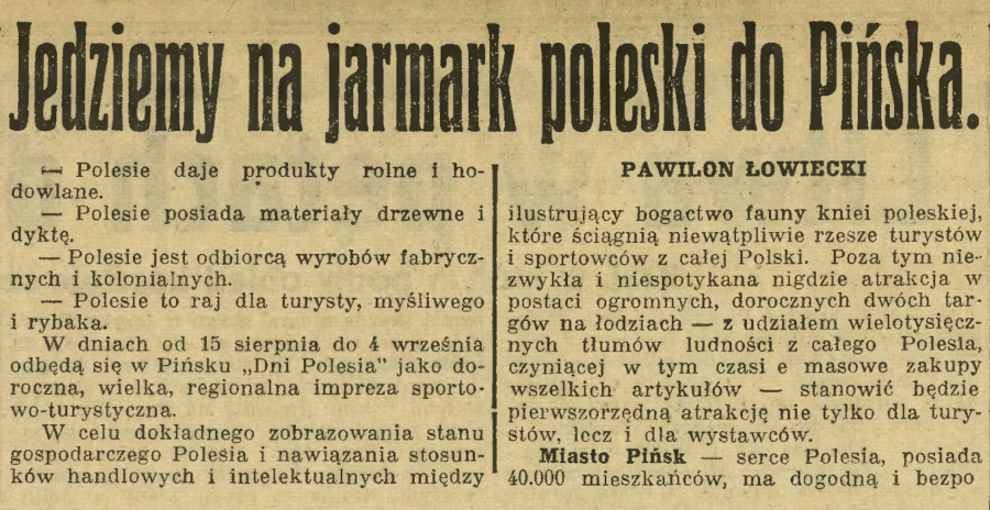 Zaznaczamy, że w ramach „Dni Polesia” odbędą się zakrojone na szeroką skalę imprezy turystyczne, sportowe, sportowo-wodne itp., a przede wszystkim specjalny PAWILON ŁOWIECKI ilustrujący bogactwo fauny kniei poleskiej, które ściągną niewątpliwie rzesze turystów i sportowców z całej Polski. Poza tym niezwykłą i niespotykaną nigdzie atrakcją w postaci ogromnych, dorocznych dwóch targów na łodziach – z udziałem wielotysięcznych tłumów ludności z całego Polesia, czyniącej w tym czasie masowe zakupy wszelkich artykułów – stanowić będzie pierwszorzędną atrakcję nie tylko dla turystów, lecz i dla wystawców.